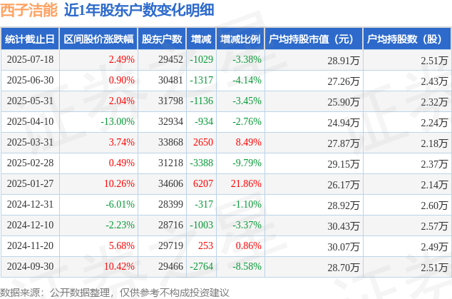 从股价来看,2025年6月30日至2025年7月18日,西子洁能区间涨幅为2.49%,在此期间股东户数减少1029.0户,减幅为3.38%。